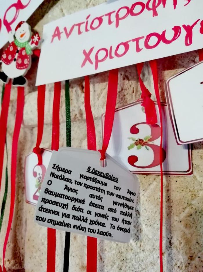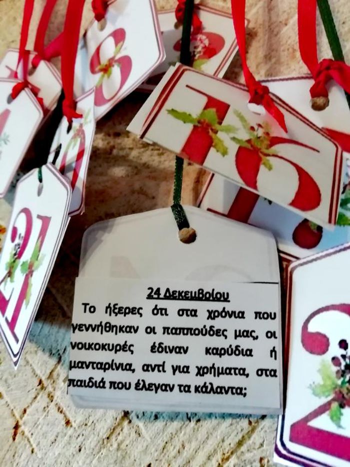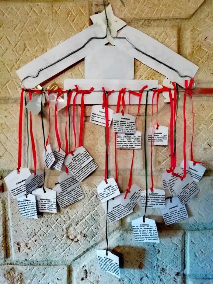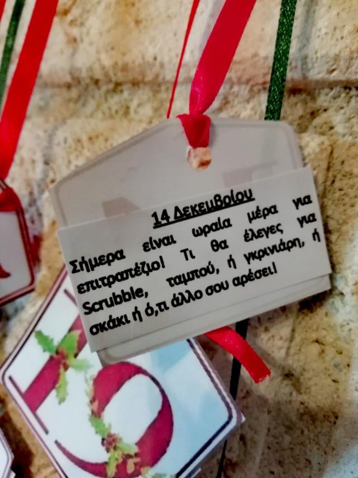 Κάθε μέρα που θα περνάει, θα πρέπει να διαβάζεται και να εκτελείται η εντολή που αναγράφεται πίσω από κάθε αριθμό και στη συνέχεια, καθώς θα βαδίζουμε στις μέρες του Δεκέμβρη να κόβουμε μία μία κορδέλα με τον αριθμό που αντιστοιχεί στην κάθε ημέρα. Προσοχή: τα χαρτάκια των επόμενων ημερών δεν θα πρέπει να διαβάζονται από πριν για να υπάρχει κίνητρο και αγωνία, γι' αυτό το λόγο σας συστήνουμε να κρεμαστεί κάπου ψηλά.