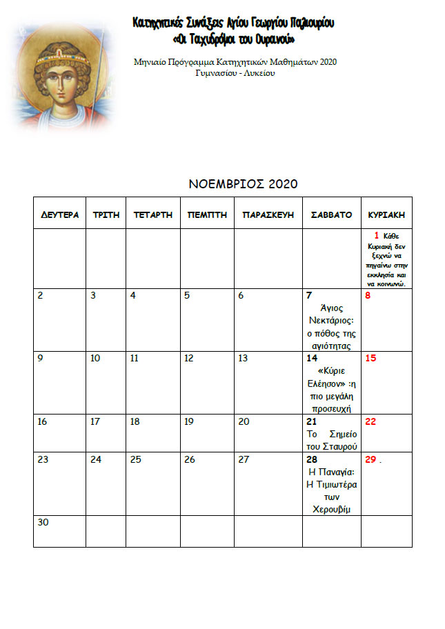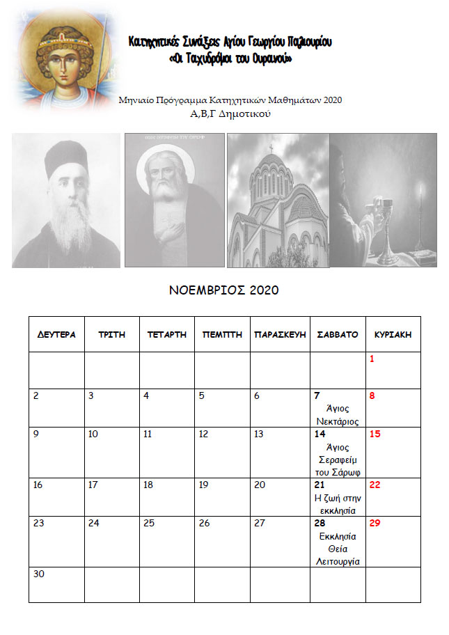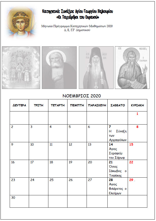 Οι Ταχυδρόμοι του Ουρανού, δημοσιεύουν το περιεχόμενο των Κατηχητικών μαθημάτων που θα διδαχθούν διαδικτυακά τα παιδιά, τον μήνα Νοέμβριο. Ευχόμαστε να αποτελέσει έμπνευση και βοήθημα για κάθε Κατηχητή, Θεολόγο ή γονέα που ασχολείται με το θέμα της Κατήχησης.