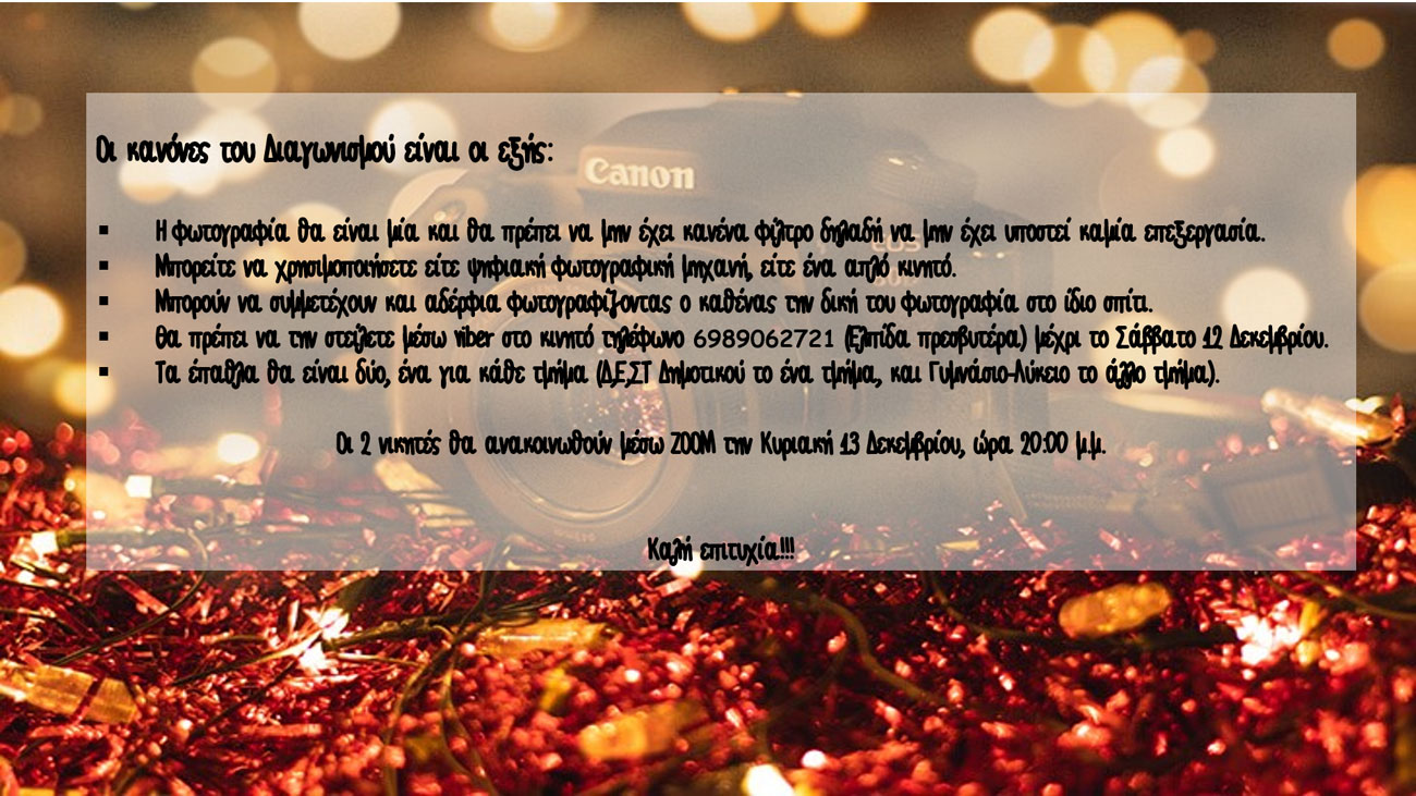 Μπορεί οι Κατηχητικές μας Συνάξεις να γίνονται πλέον από απόσταση, όμως αυτό δεν μας εμποδίζει στο να συνεχίζουμε τις δράσεις μας έστω και διαδικτυακά. Τα Χριστούγεννα έρχονται! Γι' αυτό τον λόγο, σιγά σιγά όλοι θα μπούμε στην διαδικασία να στολίσουμε το σπίτι μας. Αυτό που ζητάμε φέτος από τα παιδιά, είναι να φωτογραφίσουν κάποιο σημείο ή διακοσμητικό αντικείμενο του σπιτιού τους που να "φωνάζει" Χριστούγεννα. Λεπτομέρειες και όρους συμμετοχής θα δείτε παρακάτω.